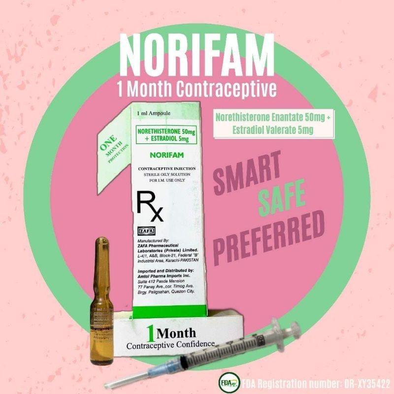 Buy a box of Norifam today and experience. Norifam is a brand of injectable contraceptive that is effective for 1 month. Just like any contraceptive it should be injected on the first day of your menstrual period first day of.